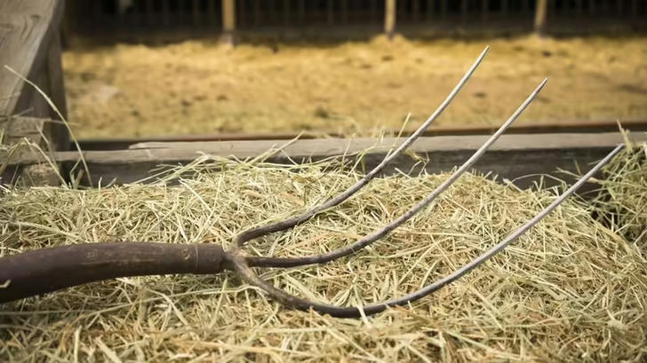 Correct Incorrect Cet outil avec un long manche et des pointes acérées est parfait pour soulever le foin ou l'herbe—faites juste attention à vos orteils !